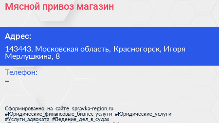 Мясной привоз, магазин по адресу 143443, Московская область, Красногорск, Игоря Мерлушкина, 8 в дальнейшем Организация, размещена в следующих категориях: