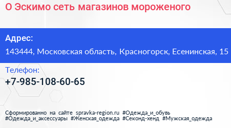 О! Эскимо, сеть магазинов мороженого по адресу 143444, Московская область, Красногорск, Есенинская, 15 в дальнейшем Организация, размещена в следующих категориях: