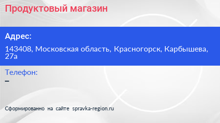 Продуктовый магазин по адресу 143408, Московская область, Красногорск, Карбышева, 27а в дальнейшем Организация, размещена в следующих категориях: