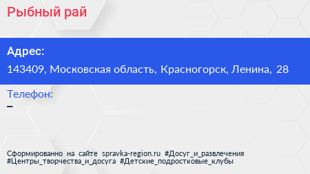 Рыбный рай по адресу 143409, Московская область, Красногорск, Ленина, 28 в дальнейшем Организация, размещена в следующих категориях: