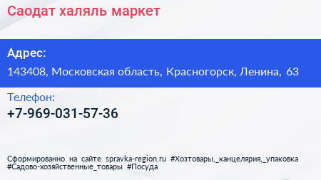 Саодат, халяль-маркет по адресу 143408, Московская область, Красногорск, Ленина, 63 в дальнейшем Организация, размещена в следующих категориях: