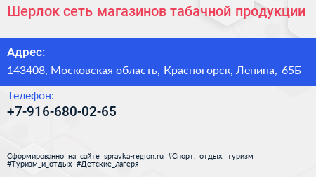 Шерлок, сеть магазинов табачной продукции по адресу 143408, Московская область, Красногорск, Ленина, 65Б в дальнейшем Организация, размещена в следующих категориях: