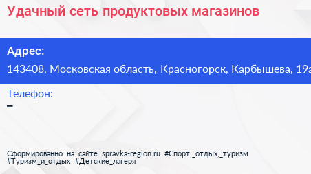 Удачный, сеть продуктовых магазинов по адресу 143408, Московская область, Красногорск, Карбышева, 19а в дальнейшем Организация, размещена в следующих категориях: