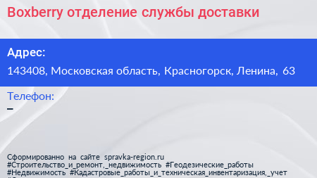 Boxberry, отделение службы доставки по адресу 143408, Московская область, Красногорск, Ленина, 63 в дальнейшем Организация, размещена в следующих категориях: