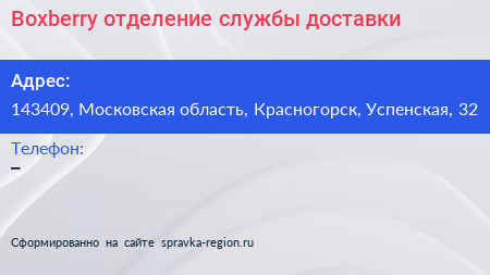 Boxberry, отделение службы доставки по адресу 143409, Московская область, Красногорск, Успенская, 32 в дальнейшем Организация, размещена в следующих категориях: