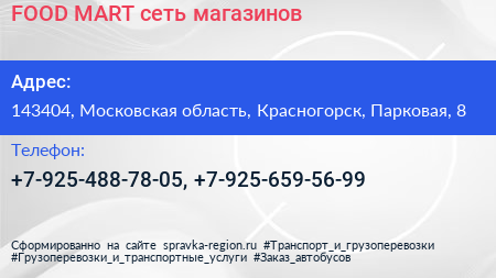 FOOD MART, сеть магазинов по адресу 143404, Московская область, Красногорск, Парковая, 8 в дальнейшем Организация, размещена в следующих категориях: