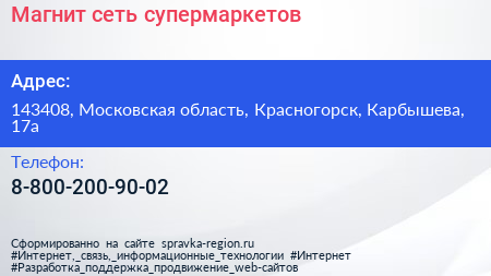 Магнит, сеть супермаркетов по адресу 143408, Московская область, Красногорск, Карбышева, 17а в дальнейшем Организация, размещена в следующих категориях: