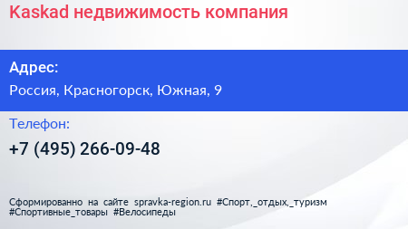 Kaskad недвижимость, компания по адресу 9, Южная улица, Поселок таунхаусов "Сабурово парк", Сабурово, городской округ Красногорск, Московская область, Центральный федеральный округ, 143442, Россия в дальнейшем Организация, размещена в следующих категориях: