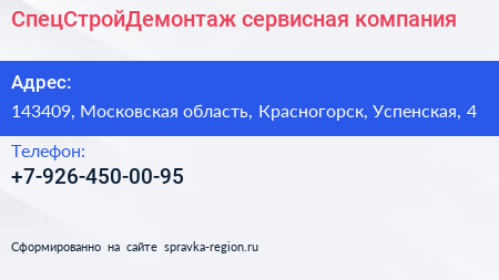 СпецСтройДемонтаж, сервисная компания по адресу 143409, Московская область, Красногорск, Успенская, 4 в дальнейшем Организация, размещена в следующих категориях: