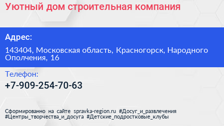 Уютный дом, строительная компания по адресу 143404, Московская область, Красногорск, Народного Ополчения, 16 в дальнейшем Организация, размещена в следующих категориях: