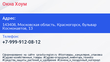 Окна Хоум по адресу 143408, Московская область, Красногорск, бульвар Космонавтов, 13 в дальнейшем Организация, размещена в следующих категориях: