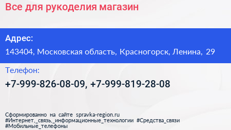 Все для рукоделия, магазин по адресу 143404, Московская область, Красногорск, Ленина, 29 в дальнейшем Организация, размещена в следующих категориях: