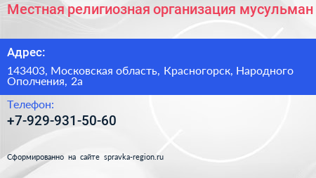 Местная религиозная организация мусульман по адресу 143403, Московская область, Красногорск, Народного Ополчения, 2а в дальнейшем Организация, размещена в следующих категориях: