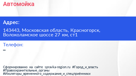 Автомойка по адресу 143443, Московская область, Красногорск, Волоколамское шоссе 27 км, ст1 в дальнейшем Организация, размещена в следующих категориях: