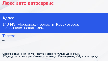 Люкс-авто, автосервис по адресу 143443, Московская область, Красногорск, Ново-Никольская, вл40 в дальнейшем Организация, размещена в следующих категориях: