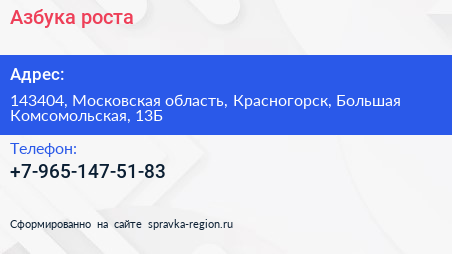 Азбука роста по адресу 143404, Московская область, Красногорск, Большая Комсомольская, 13Б в дальнейшем Организация, размещена в следующих категориях: