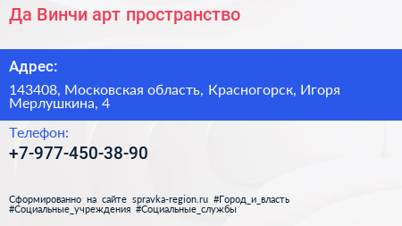 Да Винчи, арт-пространство по адресу 143408, Московская область, Красногорск, Игоря Мерлушкина, 4 в дальнейшем Организация, размещена в следующих категориях:
