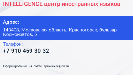 INTELLIGENCE, центр иностранных языков по адресу 143408, Московская область, Красногорск, бульвар Космонавтов, 5 в дальнейшем Организация, размещена в следующих категориях: