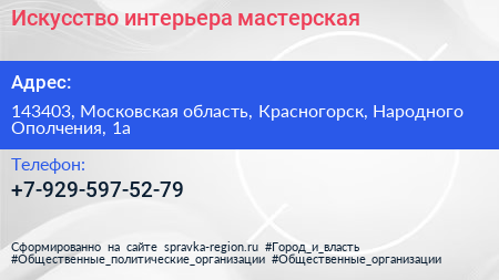 Искусство интерьера, мастерская по адресу 143403, Московская область, Красногорск, Народного Ополчения, 1а в дальнейшем Организация, размещена в следующих категориях: