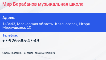 Мир Барабанов, музыкальная школа по адресу 143443, Московская область, Красногорск, Игоря Мерлушкина, 10 в дальнейшем Организация, размещена в следующих категориях: