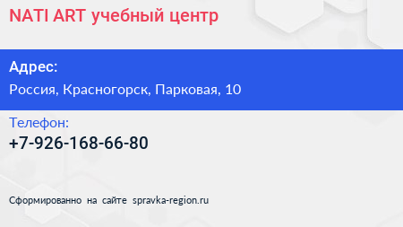 NATI.ART, учебный центр по адресу 10, Парковая улица, Жилой комплекс «Пятницкие Кварталы», Сабурово, городской округ Красногорск, Московская область, Центральный федеральный округ, 143442, Россия в дальнейшем Организация, размещена в следующих категориях: