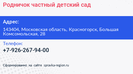 Родничок, частный детский сад по адресу 143404, Московская область, Красногорск, Большая Комсомольская, 28 в дальнейшем Организация, размещена в следующих категориях: