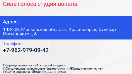 Сила голоса, студия вокала по адресу 143408, Московская область, Красногорск, бульвар Космонавтов, 6 в дальнейшем Организация, размещена в следующих категориях: