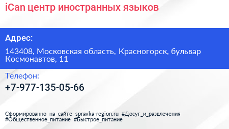 iCan, центр иностранных языков по адресу 143408, Московская область, Красногорск, бульвар Космонавтов, 11 в дальнейшем Организация, размещена в следующих категориях: