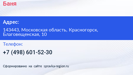 Баня по адресу 143443, Московская область, Красногорск, Благовещенская, 10 в дальнейшем Организация, размещена в следующих категориях: