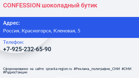 CONFESSION, шоколадный бутик по адресу Confession, 5, Кленовая улица, Микрогород «В лесу», Отрадное, городской округ Красногорск, Московская область, Центральный федеральный округ, 143442, Россия в дальнейшем Организация, размещена в следующих категориях: