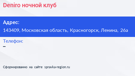 Deniro, ночной клуб по адресу 143409, Московская область, Красногорск, Ленина, 26а в дальнейшем Организация, размещена в следующих категориях: