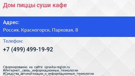 Дом пиццы & суши, кафе по адресу Дом пиццы и суши, Парковая улица, Жилой комплекс «Пятницкие Кварталы», Сабурово, городской округ Красногорск, Московская область, Центральный федеральный округ, 143442, Россия в дальнейшем Организация, размещена в следующих категориях: