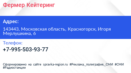 Фермер Кейтеринг по адресу 143443, Московская область, Красногорск, Игоря Мерлушкина, 6 в дальнейшем Организация, размещена в следующих категориях: