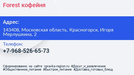 Forest, кофейня по адресу 143408, Московская область, Красногорск, Игоря Мерлушкина, 2 в дальнейшем Организация, размещена в следующих категориях:
