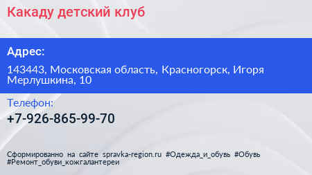 Какаду, детский клуб по адресу 143443, Московская область, Красногорск, Игоря Мерлушкина, 10 в дальнейшем Организация, размещена в следующих категориях: