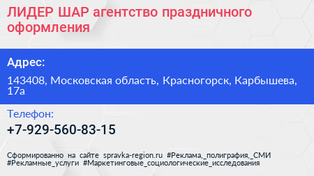 ЛИДЕР ШАР, агентство праздничного оформления по адресу 143408, Московская область, Красногорск, Карбышева, 17а в дальнейшем Организация, размещена в следующих категориях: