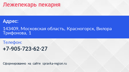 Лежепекарь, пекарня по адресу 143409, Московская область, Красногорск, Вилора Трифонова, 1 в дальнейшем Организация, размещена в следующих категориях: