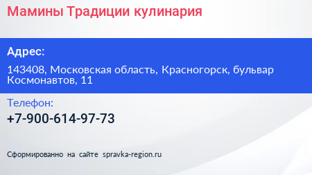Мамины Традиции, кулинария по адресу 143408, Московская область, Красногорск, бульвар Космонавтов, 11 в дальнейшем Организация, размещена в следующих категориях: