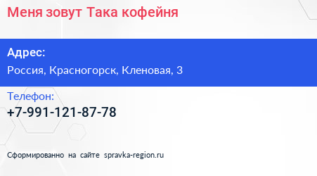 Меня зовут Така, кофейня по адресу Меня зовут Така, 3, Кленовая улица, Микрогород «В лесу», Отрадное, городской округ Красногорск, Московская область, Центральный федеральный округ, 143442, Россия в дальнейшем Организация, размещена в следующих категориях: