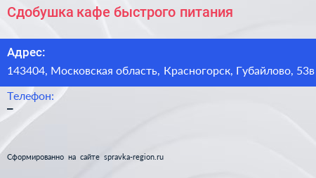 Сдобушка, кафе быстрого питания по адресу 143404, Московская область, Красногорск, Губайлово, 53в в дальнейшем Организация, размещена в следующих категориях: