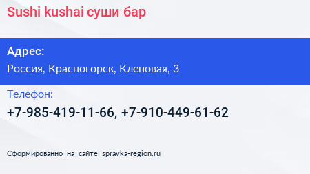Sushi kushai, суши-бар по адресу Sushi kushai, 3, Кленовая улица, Микрогород «В лесу», Отрадное, городской округ Красногорск, Московская область, Центральный федеральный округ, 143442, Россия в дальнейшем Организация, размещена в следующих категориях:
