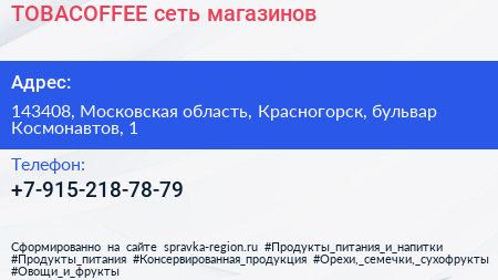 TOBACOFFEE, сеть магазинов по адресу 143408, Московская область, Красногорск, бульвар Космонавтов, 1 в дальнейшем Организация, размещена в следующих категориях: