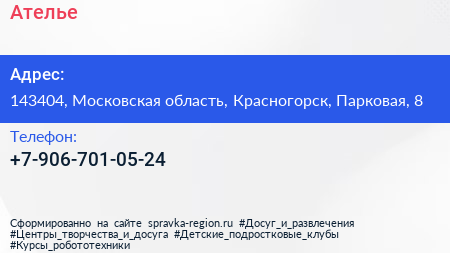 Ателье по адресу 143404, Московская область, Красногорск, Парковая, 8 в дальнейшем Организация, размещена в следующих категориях: