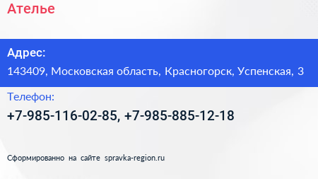 Ателье по адресу 143409, Московская область, Красногорск, Успенская, 3 в дальнейшем Организация, размещена в следующих категориях: