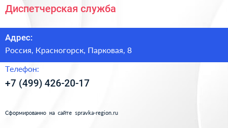Диспетчерская служба по адресу 8, Парковая улица, Жилой комплекс «Пятницкие Кварталы», Сабурово, городской округ Красногорск, Московская область, Центральный федеральный округ, 143442, Россия в дальнейшем Организация, размещена в следующих категориях: