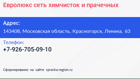 Евролюкс, сеть химчисток и прачечных по адресу 143408, Московская область, Красногорск, Ленина, 63 в дальнейшем Организация, размещена в следующих категориях: