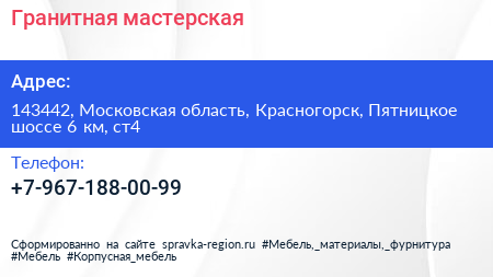 Гранитная мастерская по адресу 143442, Московская область, Красногорск, Пятницкое шоссе 6 км, ст4 в дальнейшем Организация, размещена в следующих категориях: