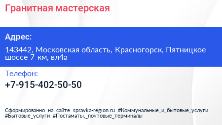 Гранитная мастерская по адресу 143442, Московская область, Красногорск, Пятницкое шоссе 7 км, вл4а в дальнейшем Организация, размещена в следующих категориях: