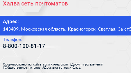 Халва, сеть почтоматов по адресу 143409, Московская область, Красногорск, Светлая, 3а ст5 в дальнейшем Организация, размещена в следующих категориях: