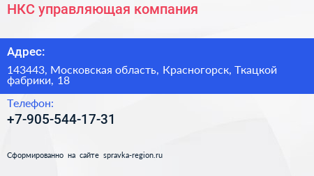 НКС, управляющая компания по адресу 143443, Московская область, Красногорск, Ткацкой фабрики, 18 в дальнейшем Организация, размещена в следующих категориях: